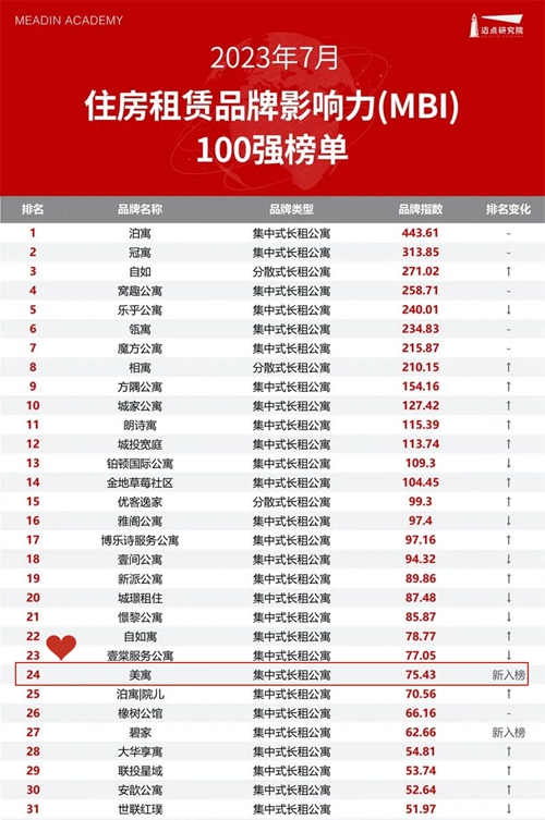 邁點研究院獨家發(fā)布的“2023年7月住房租賃品牌影響力(MBI)100強榜單”。鄭州城市發(fā)展集團城發(fā)美寓進入榜單前二十五。