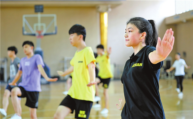 來自鄭州西亞斯學(xué)院和鄭州七中的18名運動員正在進行民族健身操訓(xùn)練。