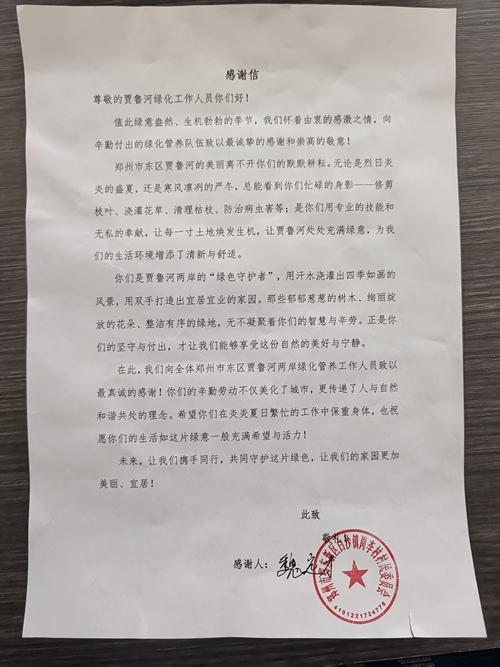 守護(hù)賈魯河的生態(tài)之美,是綠化養(yǎng)護(hù)人矢志不渝的責(zé)任與光榮使命。每一片蔥郁的樹(shù)林、每一處綻放的花海、每一聲清脆的鳥(niǎo)鳴,都見(jiàn)證著養(yǎng)護(hù)團(tuán)隊(duì)的匠心與堅(jiān)守。此次收到鄭東新區(qū)崗李村村委的錦旗和感謝信,令全體團(tuán)隊(duì)倍感鼓舞。這不僅是對(duì)養(yǎng)護(hù)團(tuán)隊(duì)專(zhuān)業(yè)能力的認(rèn)可,更是對(duì)賈魯河生態(tài)治理成效的高度肯定。
