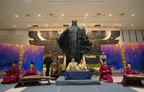當(dāng)晚,博物院不再是靜默的展廳,而化身為穿越時(shí)空的舞臺(tái)。以莊嚴(yán)的商湯雕像為背景,古器樂節(jié)目《商王的盛宴》奏響,悠揚(yáng)古樂聲中,商湯與民同宴、祈求順?biāo)斓臍v史場景再現(xiàn)眼前,令人恍若穿越三千年。